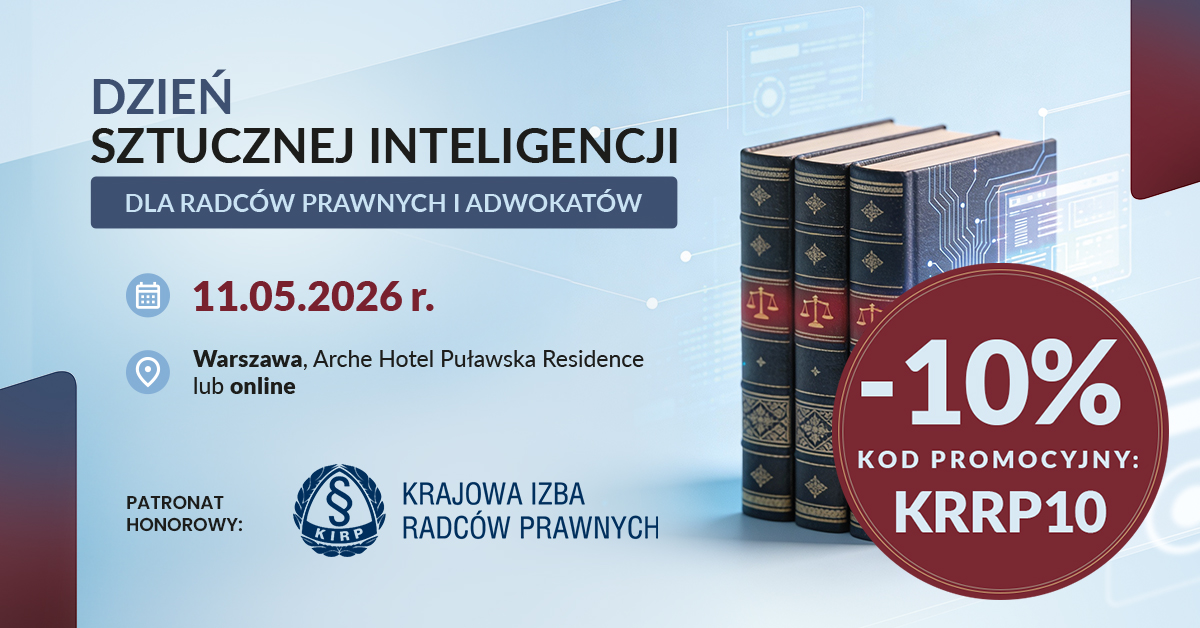 Krajowa Izba Radców Prawnych objęła patronatem honorowym konferencję „Dzień Sztucznej Inteligencji (AI) dla Radców Prawnych i Adwokatów”, która odbędzie się 11 maja 2026 r. w Warszawie przy ul. Puławskiej 361 (Arche Hotel Puławska Residence) oraz w formule online.